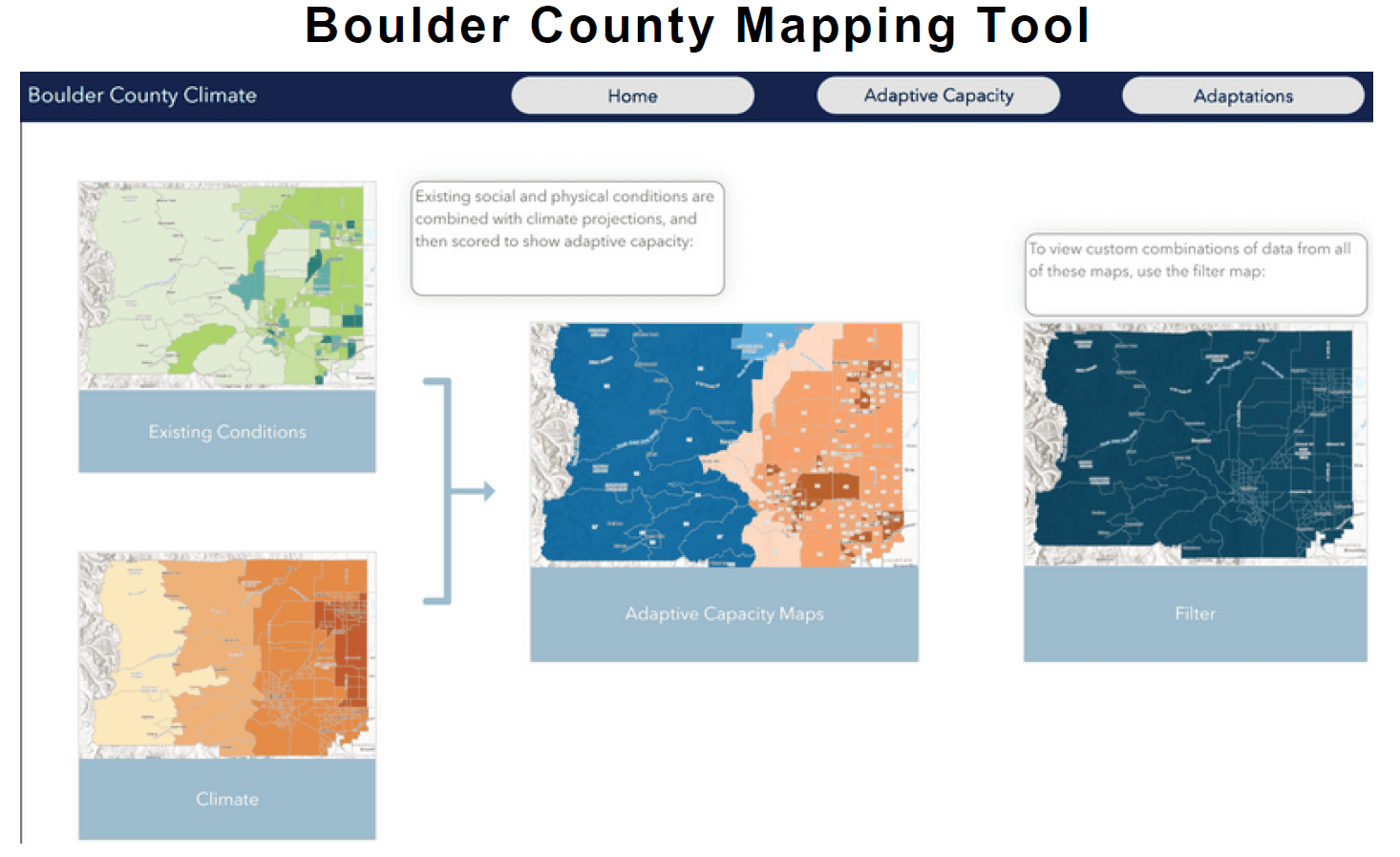 Resilient Analytics was the lead consultant in this effort, tasked with creating a map interface that conveyed the current conditions in each neighborhood, capacity of the neighborhood to adapt, climate projections, risk to each neighborhood, risks to each sector and adaptation priorities. Coordination between the county and cities was critical for long-term planning and success. Resilient Analytics developed a new GIS interface, creating an interactive environment that allowed county officials to access and utilize the extensive data in the new system.