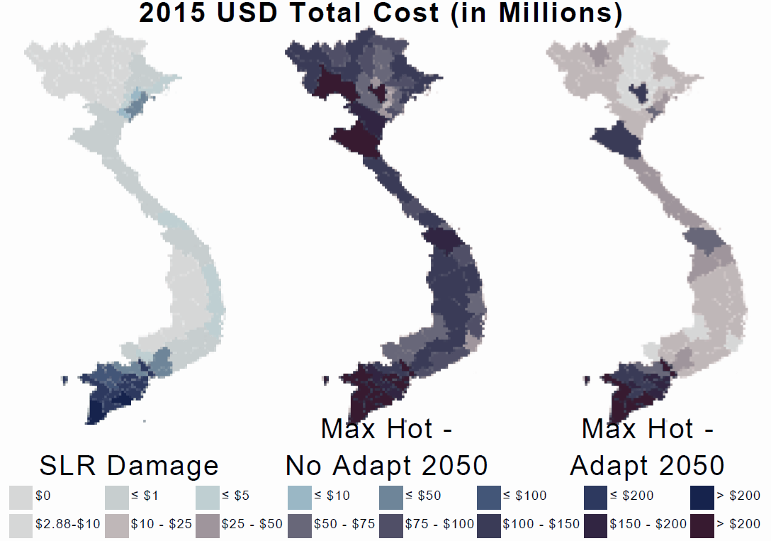 Vietnam is experiencing climate challenges throughout the country, but particularly along the Mekong River and in coastal sectors. Increased floods and coastal inundation are impacting future development of key agricultural areas. The climate analysis was undertaken to understand the potential rate at which further impacts would occur in this sector and the larger economic effects.